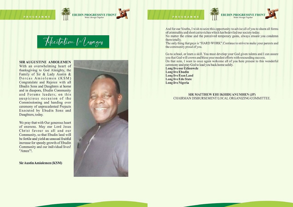 Structurally, each of the quarters that make up Ebudin is inter-dependent on each other for daily subsistence. They help one another in the discharge of various manual labours such as building of their houses, maintenance of roads, clearing of farm land and planting of crops. Communal help are offered without restraint to location or boundaries. Each quarter also has their village head known as “Odin-Idimu”. This Odin-Idimu also performs basically the same functions as the Odionwele except that his authority is restricted or confined to that of his quarter. Decisions taken by the Head of quarter level is deemed final in so far as there are no further complaints or objections from anybody on the decision. Where there is any complaint, such will now be referred to the Elders’ council for final resolution.